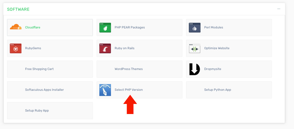 1. Access the PHP Selector. Log into your cPanel account and scroll to the "Software/Services" section of your cPanel home page and click the icon named "Select PHP Version".