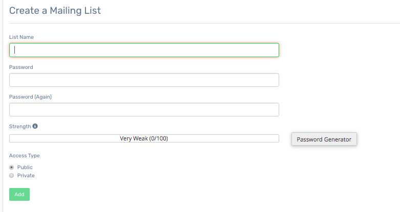 5. Once the mailing list is created, it will appear in the list below where you can either change the password, delete it, or manage it (add email addresses, etc)